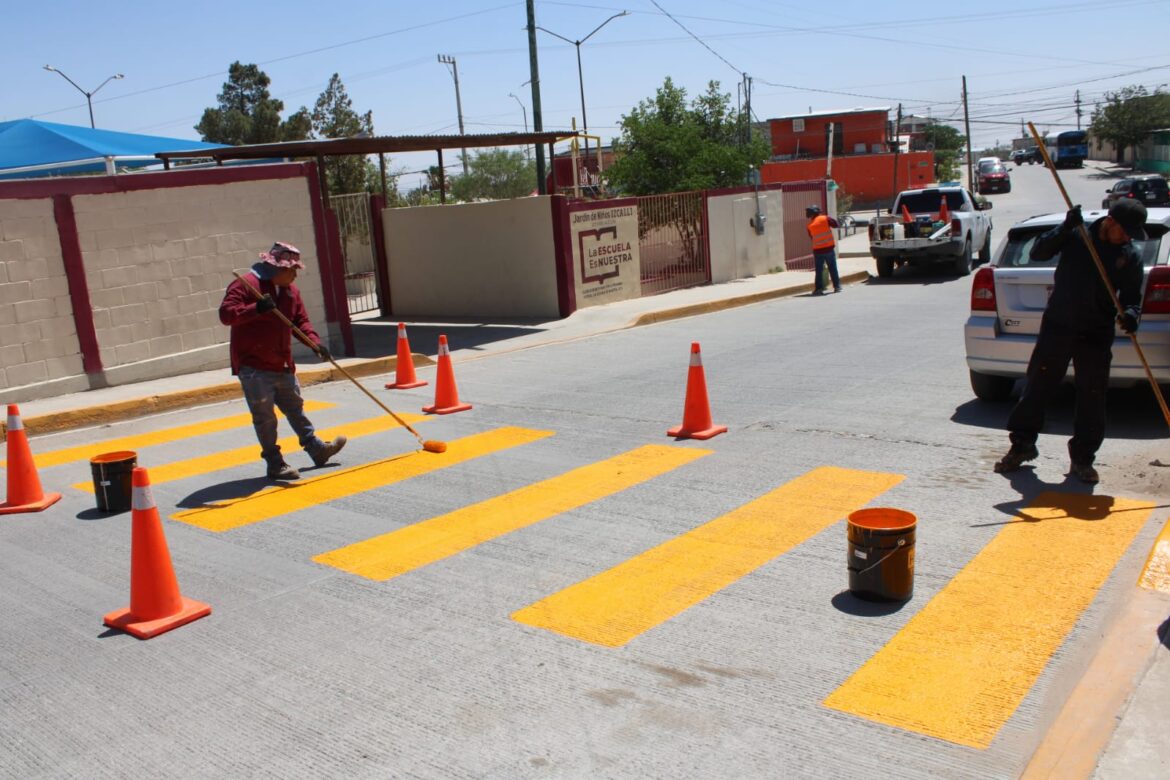 Los trabajos consistieron en el repintado de los pasos peatonales y los bordes de banqueta ubicados en las inmediaciones de ambas instituciones educativas, con el objetivo de mejorar la visibilidad y protección de peatones, especialmente de niñas, niños y sus familias, durante las horas de entrada y salida.
