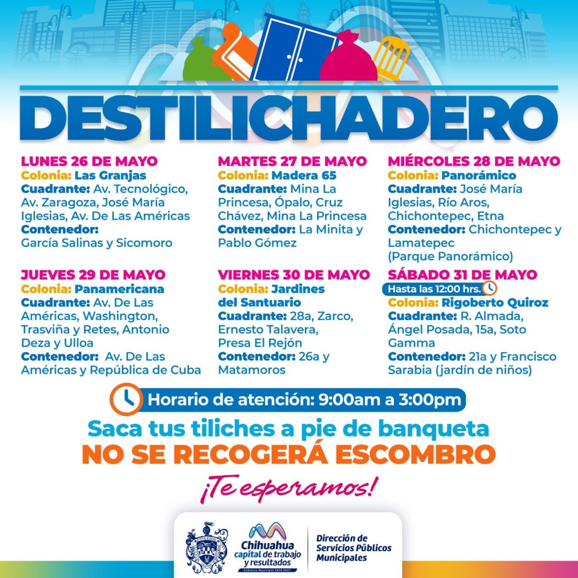 Para evitar acumulaciones de basura de grandes dimensiones en las viviendas, que podría generar plagas o problemas de salud, el Gobierno Municipal, a través de la Dirección de Servicios Públicos Municipales, informa el calendario del programa Destilichadero, que se realizará del 26 al 31 de mayo en seis colonias de la Capital.