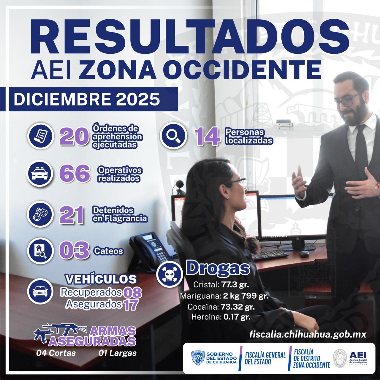 La Agencia Estatal de Investigación (AEI) en la Zona Occidente, informó sobre los resultados de actividades realizadas en el mes de diciembre del 2025 en los 20 municipios que componen la región.