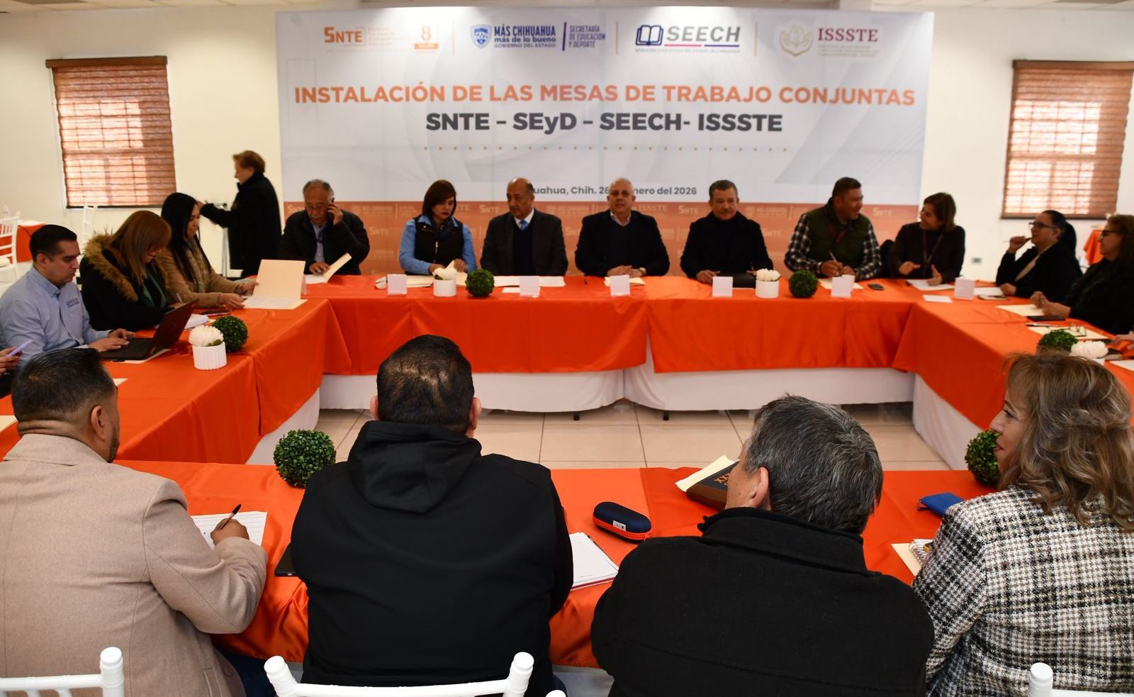 La Secretaría de Educación y Deporte (SEyD), Servicios Educativos del Estado de Chihuahua (Seech), la Sección 8 del Sindicato Nacional de Trabajadores de la Educación (SNTE) y el Instituto de Seguridad y Servicios Sociales de los Trabajadores del Estado (Issste), llevaron a cabo la instalación de mesas de trabajo conjuntas para analizar acciones que permitan una mayor armonización y vinculación interinstitucional.