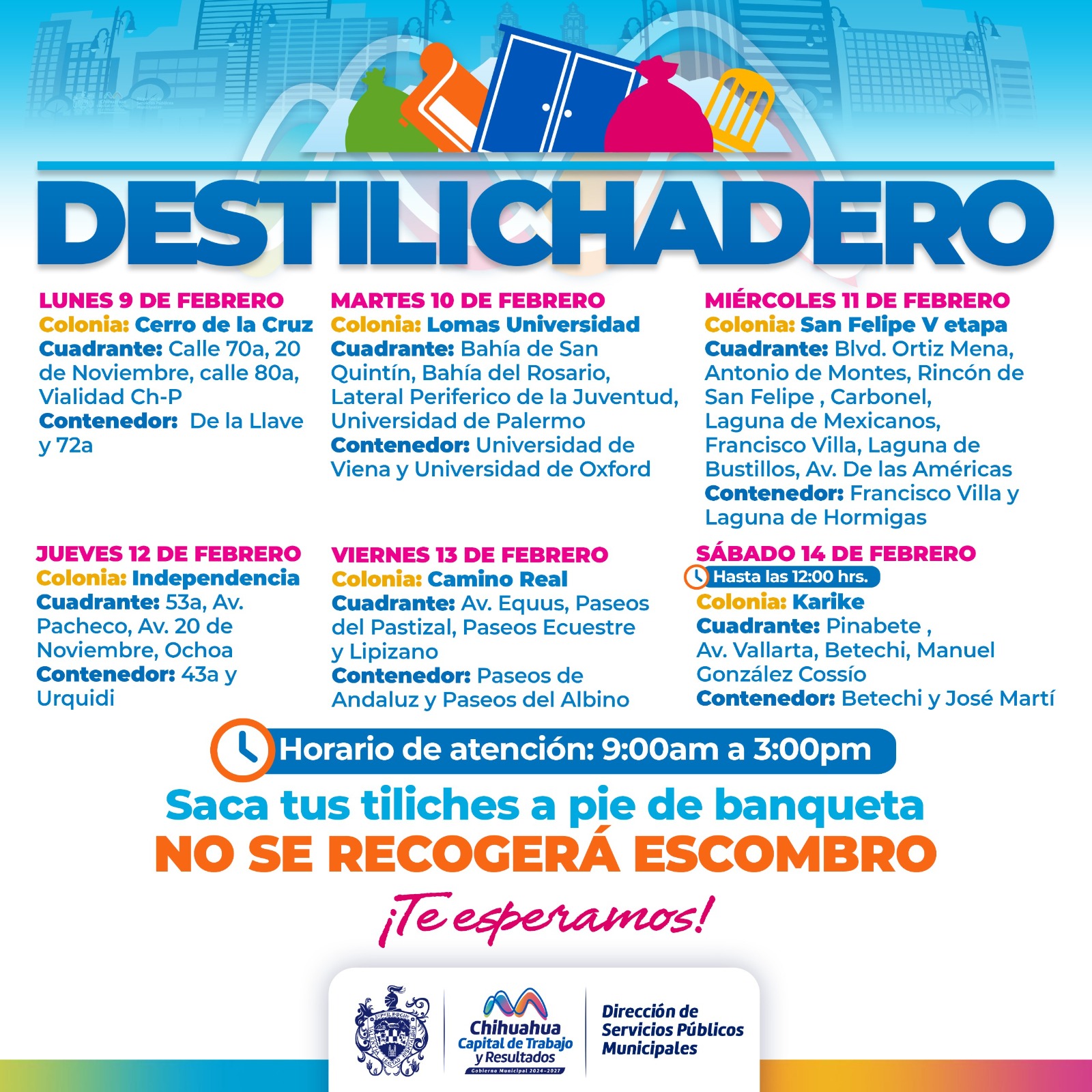 H. Ciudad de Chihuahua, Chih., a 7 de febrero de 2026.- Para evitar acumulaciones de basura de grandes dimensiones en las viviendas, que podría generar plagas o problemas de salud, el Gobierno Municipal, a través de la Dirección de Servicios Públicos Municipales, informa el calendario del programa Destilichadero, que se realizará en seis colonias de la capital del 9 al 14 de febrero.