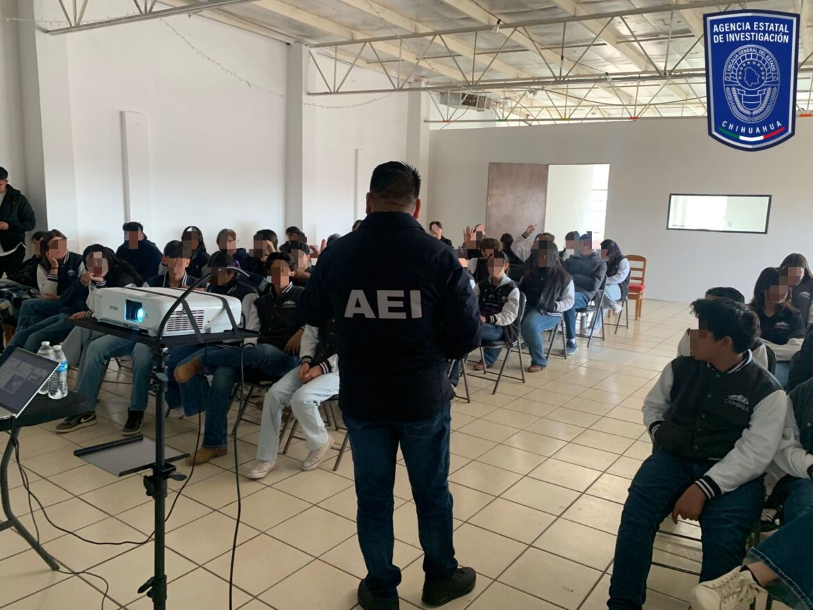 Elementos de la Agencia Estatal de Investigación (AEI), adscritos al Grupo de Orientación Escolar Chihuahuense (GOECHI) en la Fiscalía de Distrito Zona Noroeste, impartieron pláticas formativas a estudiantes del Colegio Nacional Cumbres, ubicado en la colonia Villahermosa, del municipio de Nuevo Casas Grandes.