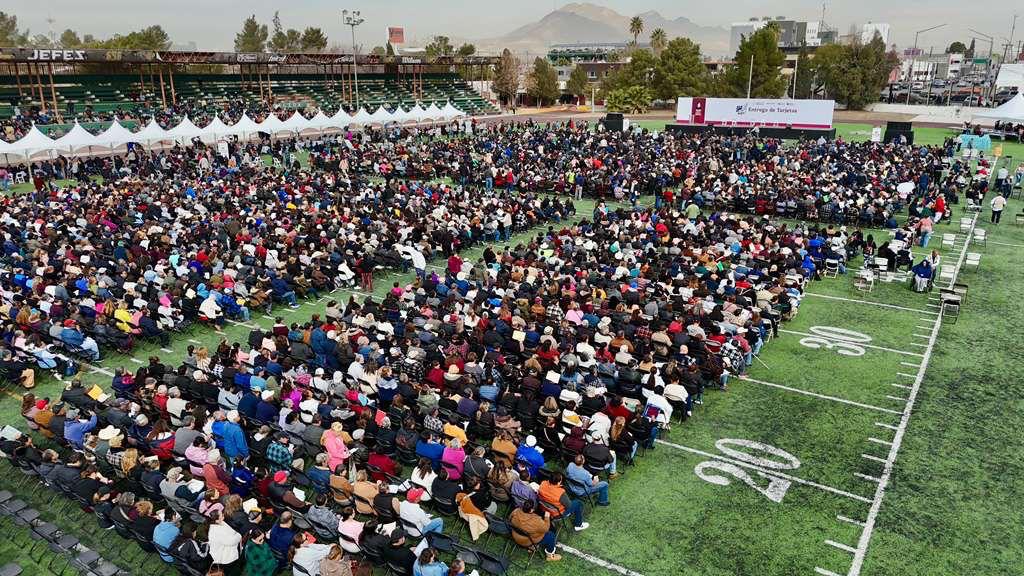La delegada estatal de Programas para el Bienestar en Chihuahua, Mayra Chávez Jiménez, acompañada por el Director Regional de Programas para el Bienestar en la región de Juárez, Omar Helem García Palomares, encabezó el evento de entrega de tarjetas de Banco Bienestar a nuevos derechohabientes de las pensiones para personas adultas mayores y mujeres de 60 a 64 años, que se dieron cita el día de hoy en las instalaciones del Estadio 20 de Noviembre de esta ciudad fronteriza.