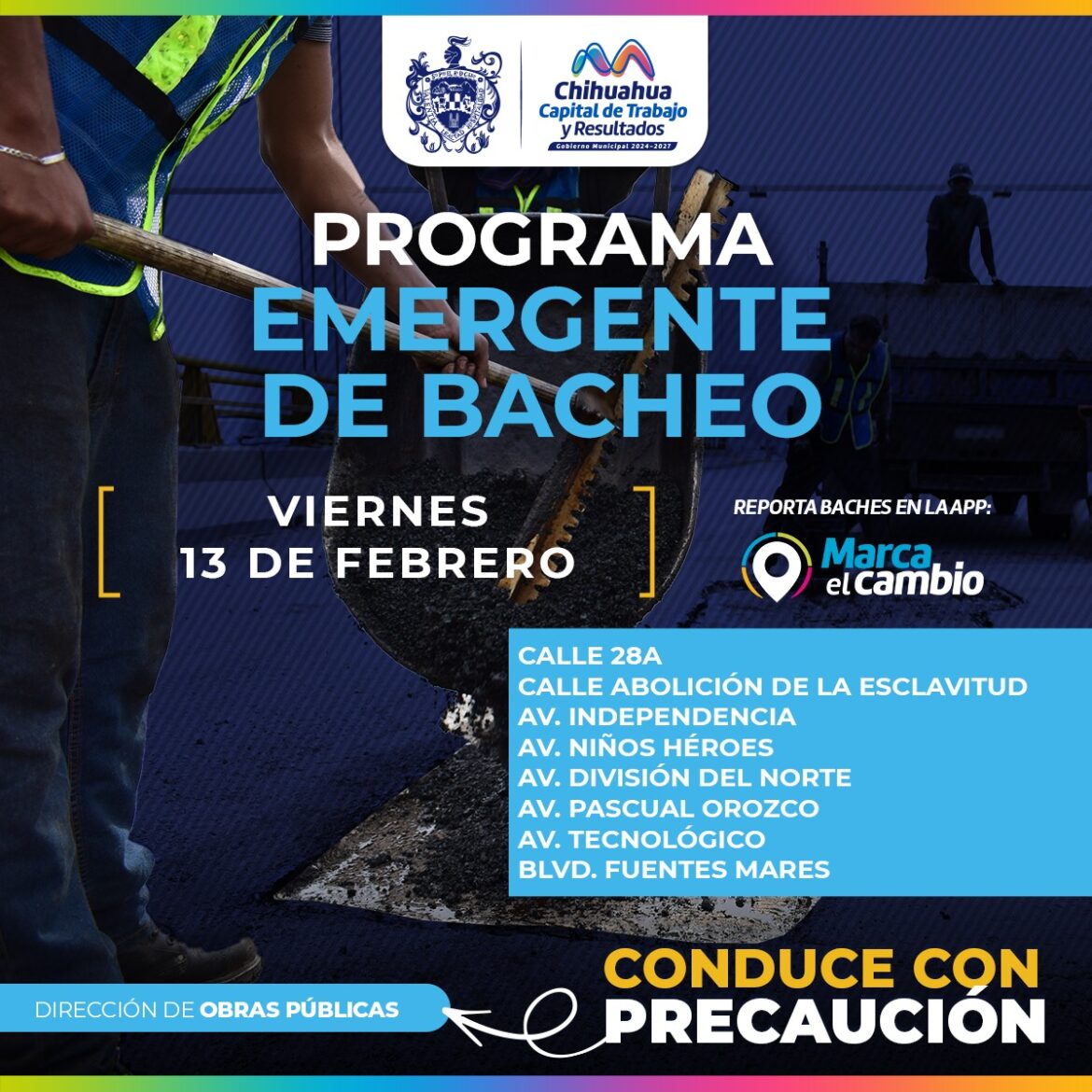 H. Ciudad de Chihuahua, Chih., a 13 de febrero de 2026.- El Gobierno Municipal, a través de la Dirección de Obras Públicas, realizará trabajos de bacheo este viernes 13 de febrero mediante el programa emergente en las calles 28a y Abolición de la Esclavitud, así como en las avenidas: Independencia, Niños Héroes, División del Norte, Pascual Orozco, Tecnológico y en el boulevard Fuentes Mares.
