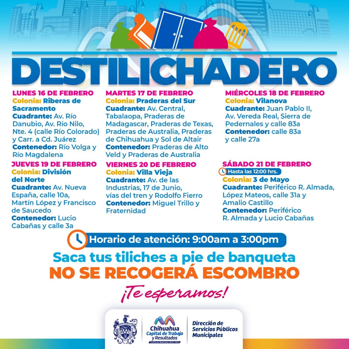 H. Ciudad de Chihuahua, Chih., a 14 de febrero de 2026.- Para evitar acumulaciones de basura de grandes dimensiones en las viviendas, que podría generar plagas o problemas de salud, el Gobierno Municipal, a través de la Dirección de Servicios Públicos Municipales, informa el calendario del programa Destilichadero, que se realizará en seis colonias de la capital del 16 al 21 de febrero.