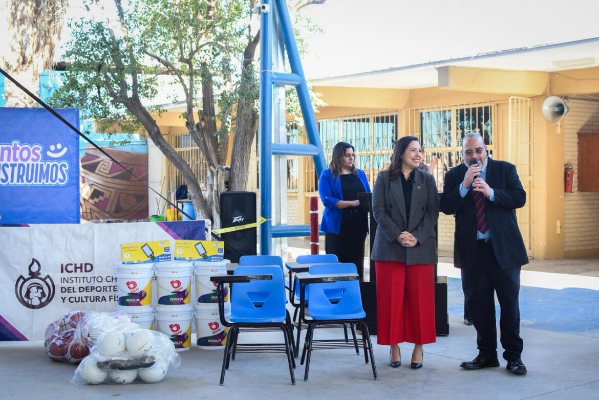 Gracias al esfuerzo conjunto con el Instituto Chihuahuense de Infraestructura Física Educativa (ICHIFE), la Secretaría de Comunicaciones y Obras Públicas (SCOP), la Subsecretaría de Movilidad y el Instituto Chihuahuense del Deporte (ICHD) se realizó la entrega de 160 butacas, 11 cubetas de pintura, 4 luminarias, 10 balones de voleibol, 1 red de voleibol, 10 balones de basquetbol, 10 balones de fútbol. Además, se colocaron señalamientos viales y se pintaron los pasos peatonales para garantizar la seguridad vial. De la misma manera, la legisladora gestionó con la Junta Municipal de Agua y Saneamiento (JMAS) la reparación de una fuga de agua y cambio del medidor del plantel educativo.