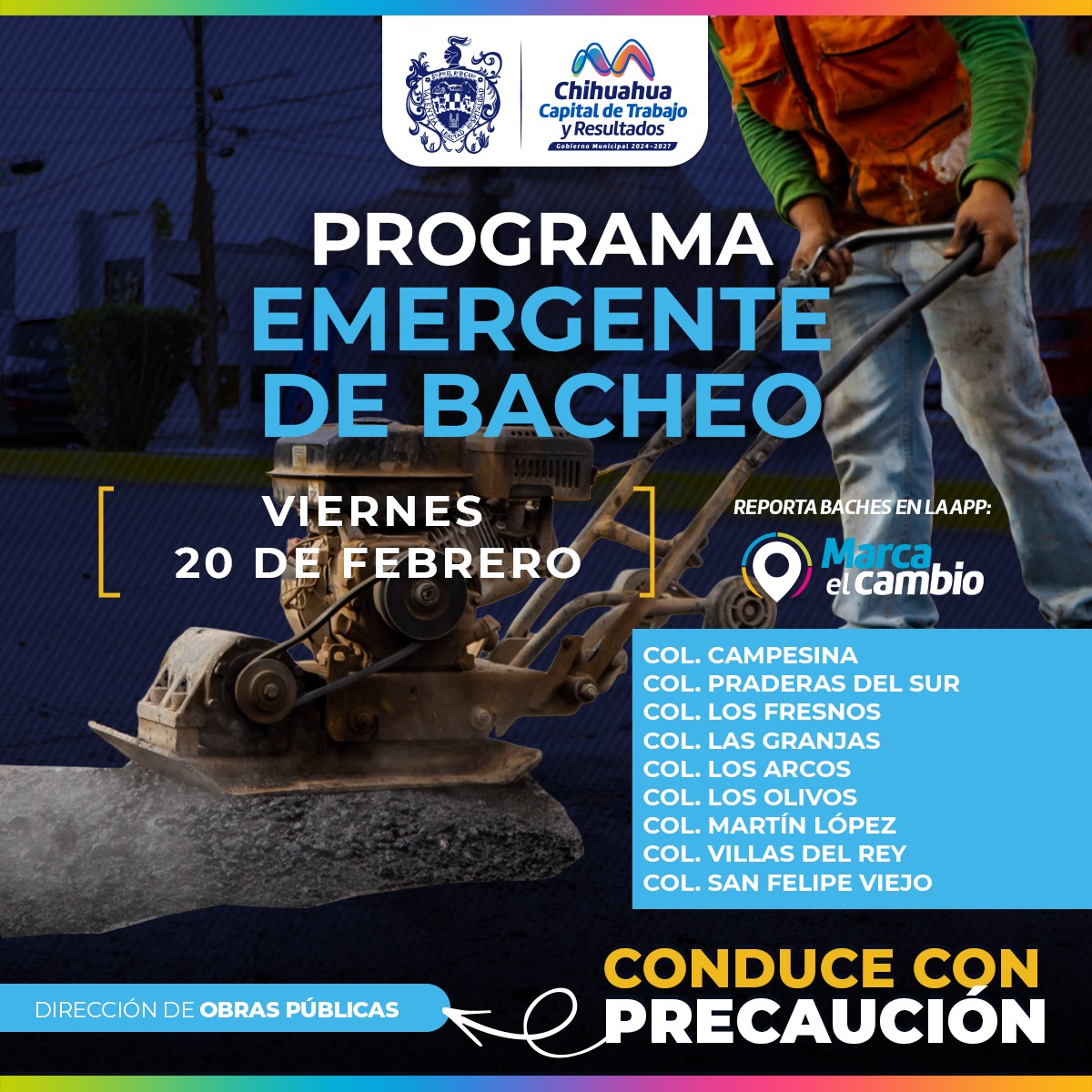 H. Ciudad de Chihuahua, Chih., a 20 de febrero de 2026.- El Gobierno Municipal, a través de la Dirección de Obras Públicas, realizará trabajos de bacheo este viernes 20 de febrero mediante el programa emergente en calles de las colonias: Campesina, Praderas del Sur, Los Fresnos, Las Granjas, Los Arcos, Los Olivos, Martín López, Villas del Rey y San Felipe Viejo.