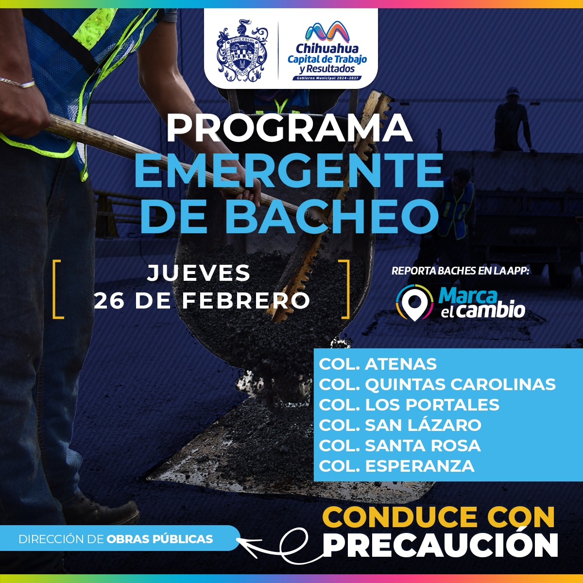 H. Ciudad de Chihuahua, Chih., a 26 de febrero de 2026.- El Gobierno Municipal, a través de la Dirección de Obras Públicas, realizará trabajos de bacheo este jueves 26 de febrero mediante el programa emergente en las calles de las colonias: Atenas, Quintas Carolinas, Los Portales, San Lázaro, Santa Rosa y Esperanza.